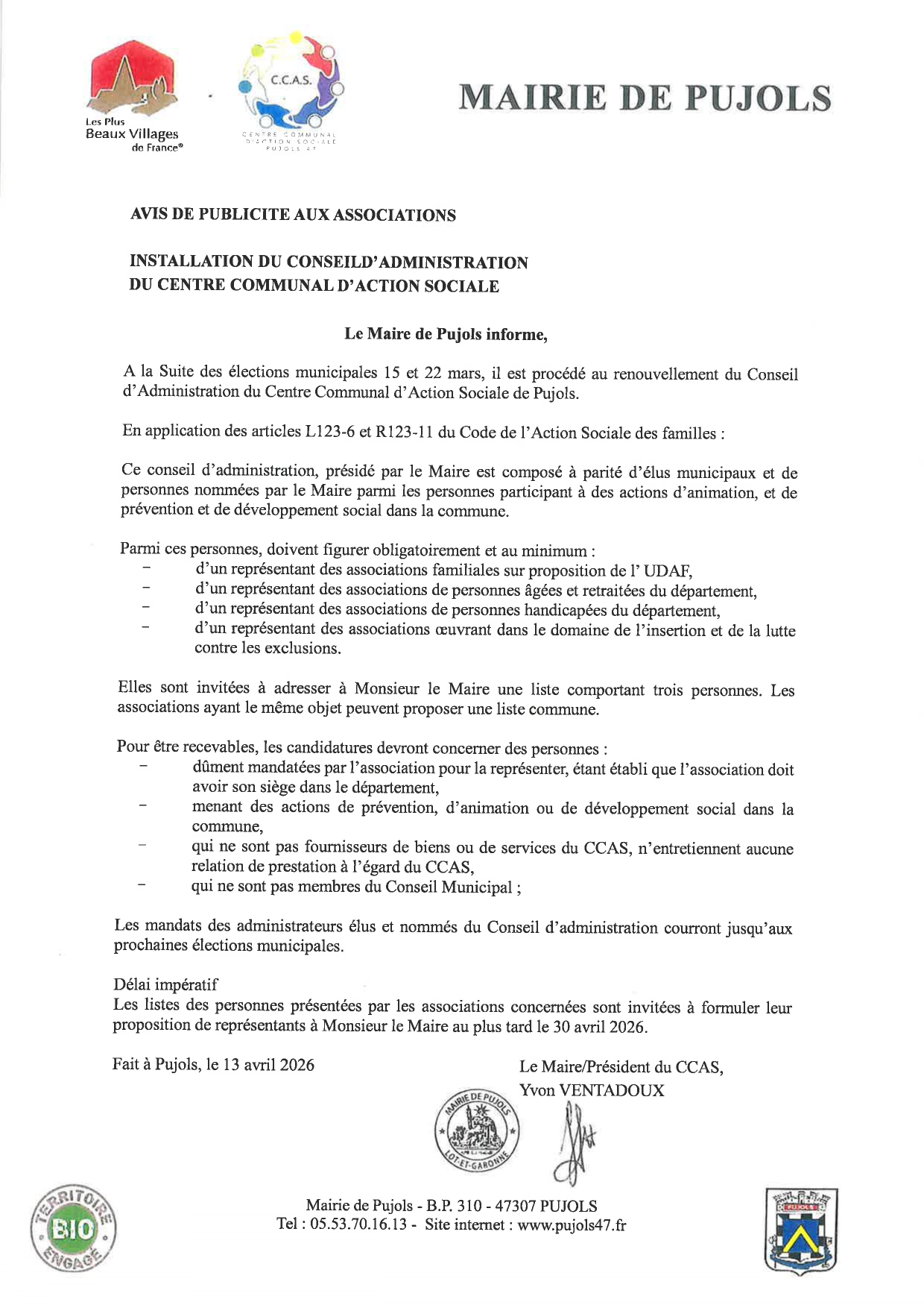 Fait à Pujols, le 13 avril 2026
