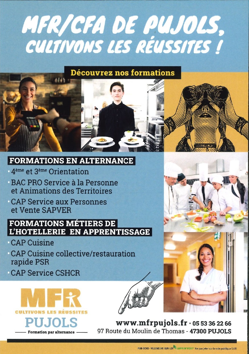 MFR-CFA PUJOLS organise les portes ouvertes samedi 15 mars De la 4ème au BAC PRO 05.53.36.22.66   www.mfrpujols.fr